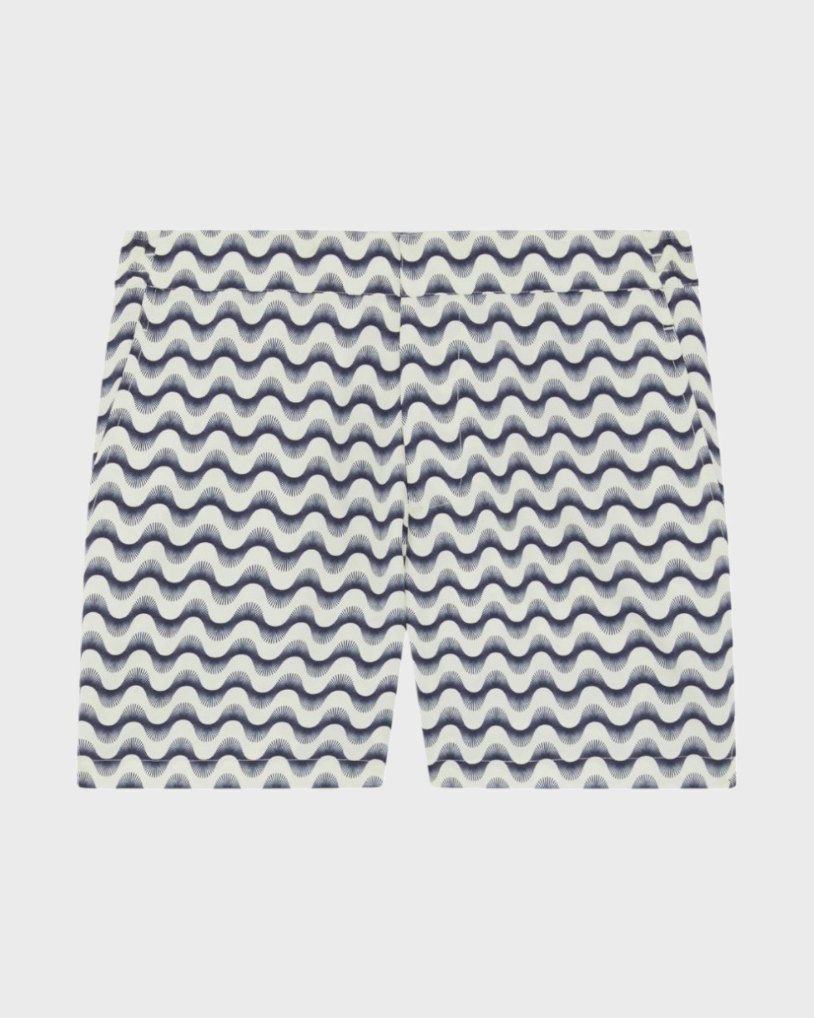 A smarter take on swimwear. Our Classic fit swim shorts feature a handsomely tapered fly-zip and button front-closure, with an elasticated back for some Carioca ease. Featuring bespoke Raio do Sol print, a sunny reimagining of our Copacabana wave design through rays. A quick-dry, beach-to-bar wardrobe staple.