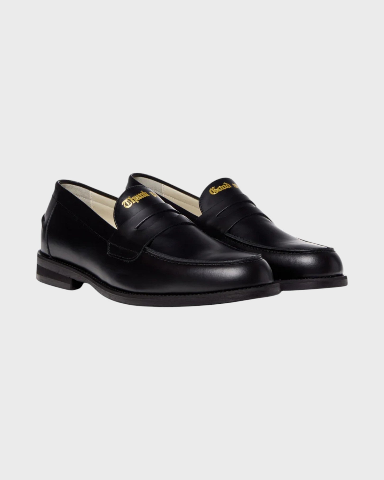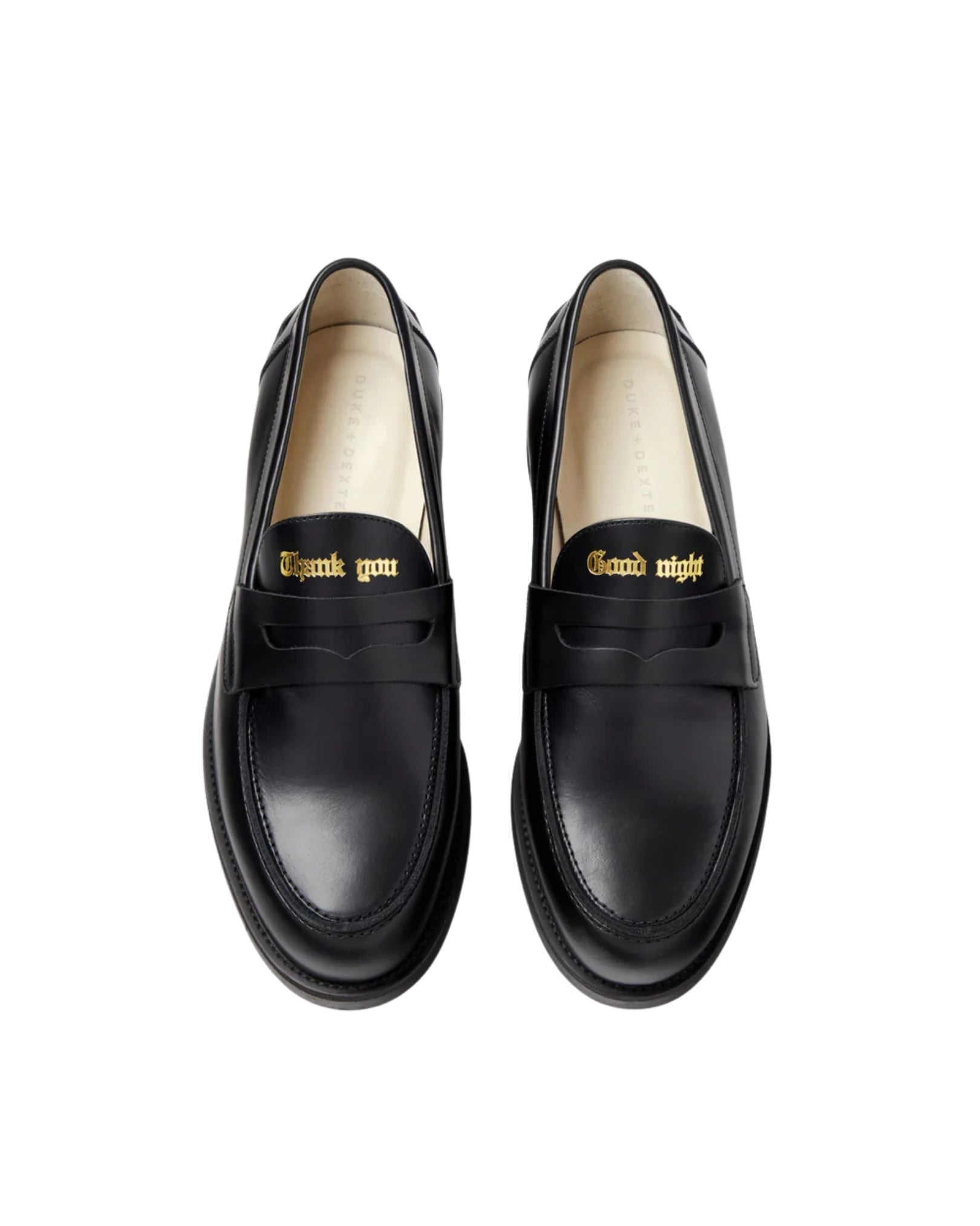 The ultimate sign off. Positioned just above the bridge, the Thank You, Good Night Penny Loafer features this iconic phrase gold foil embossed directly onto the blank vamp of our Wilde Penny Loafer, sat atop our 25mm handmade prefabricated TPU sole and lined in a premium Italian leather.