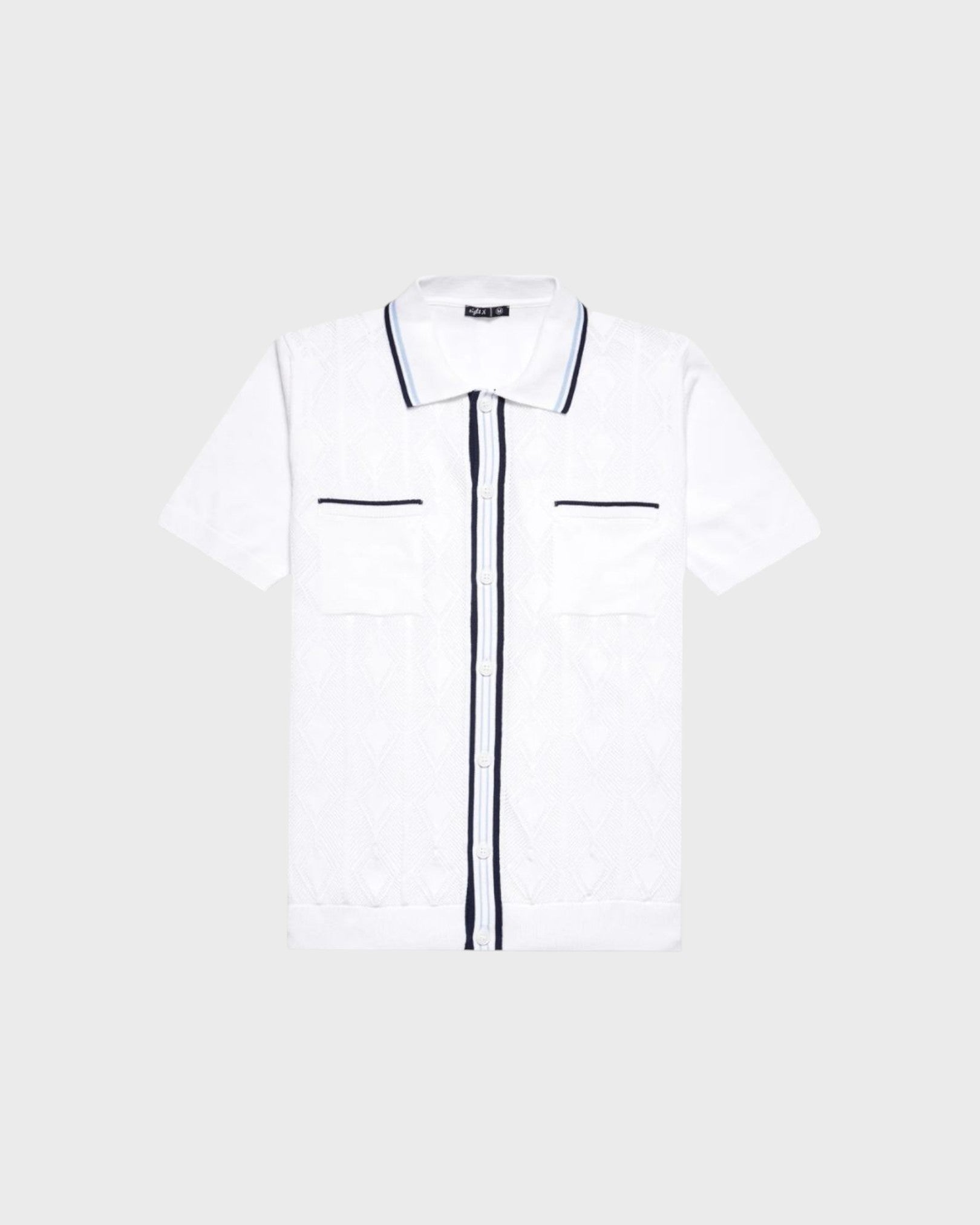 Relax in style with this luxurious knit button up short sleeve shirt. Elevating casual menswear, this top is ultra soft and breathable, and pairs great with our Essentials white crew neck t-shirt.