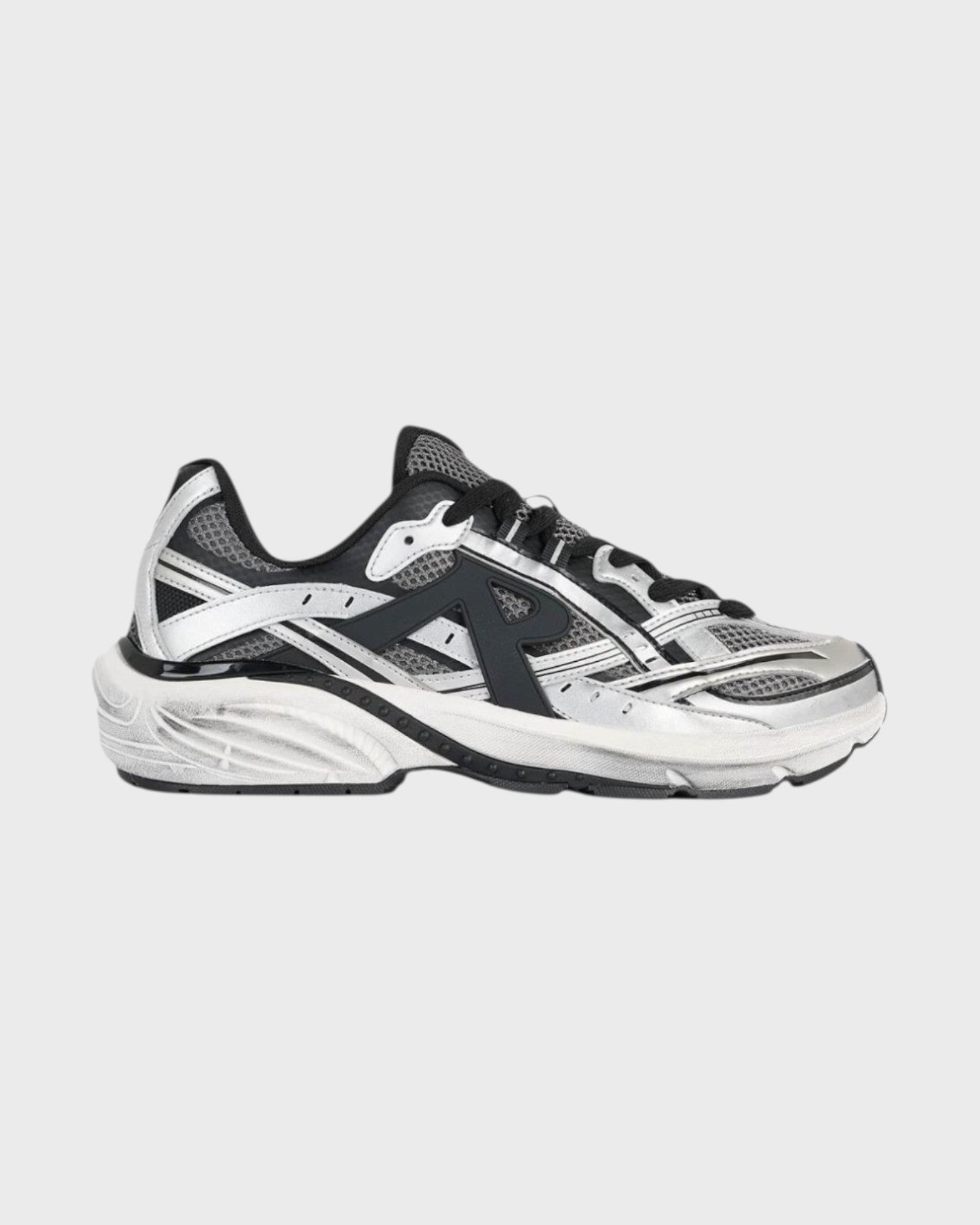 Introducing the Storm Runner in Silver/Black, our latest sneaker, inspired by a runner silhouette. Crafted with an open sandwich mesh upper, the shoe offers a lightweight construction, ideal for everyday comfort. A synthetic overlay to the upper is complete with debossed details and print, adding a layer of visual depth texture to the shoe.