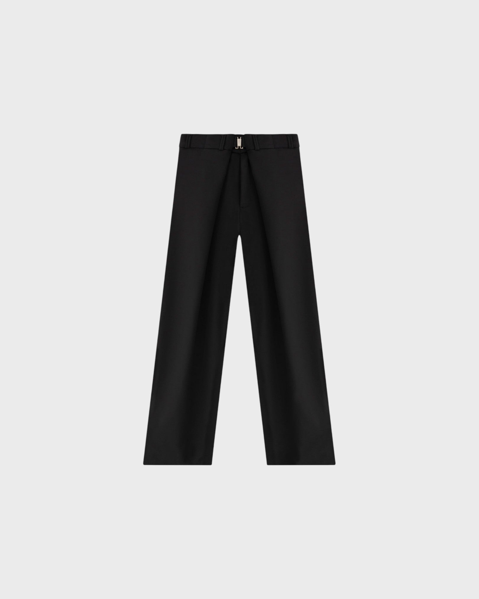 Black Trousers with Straight silhouette, made of 100% polyester fabric (365gr), with metal buckle on the waistband to fasten.