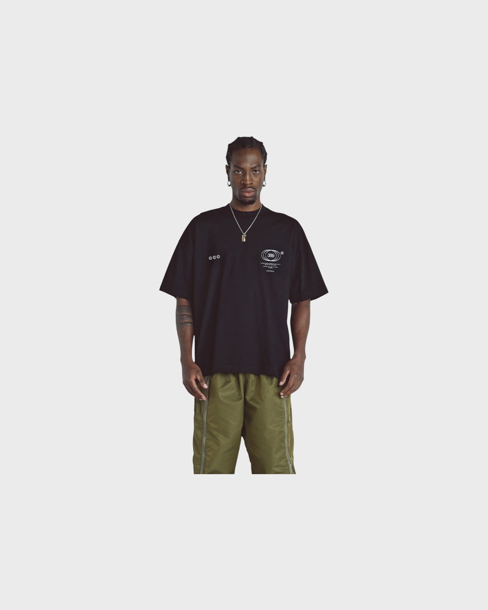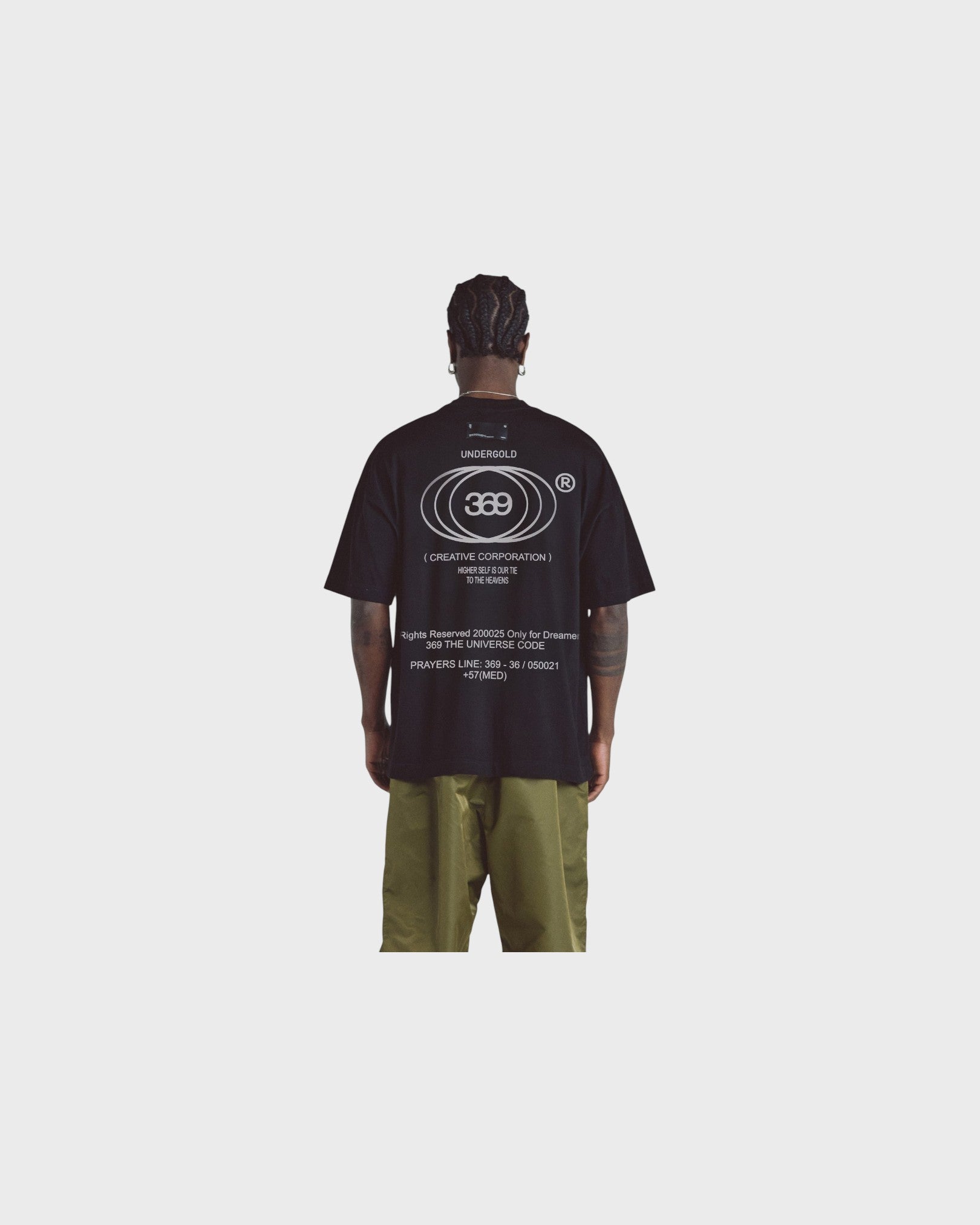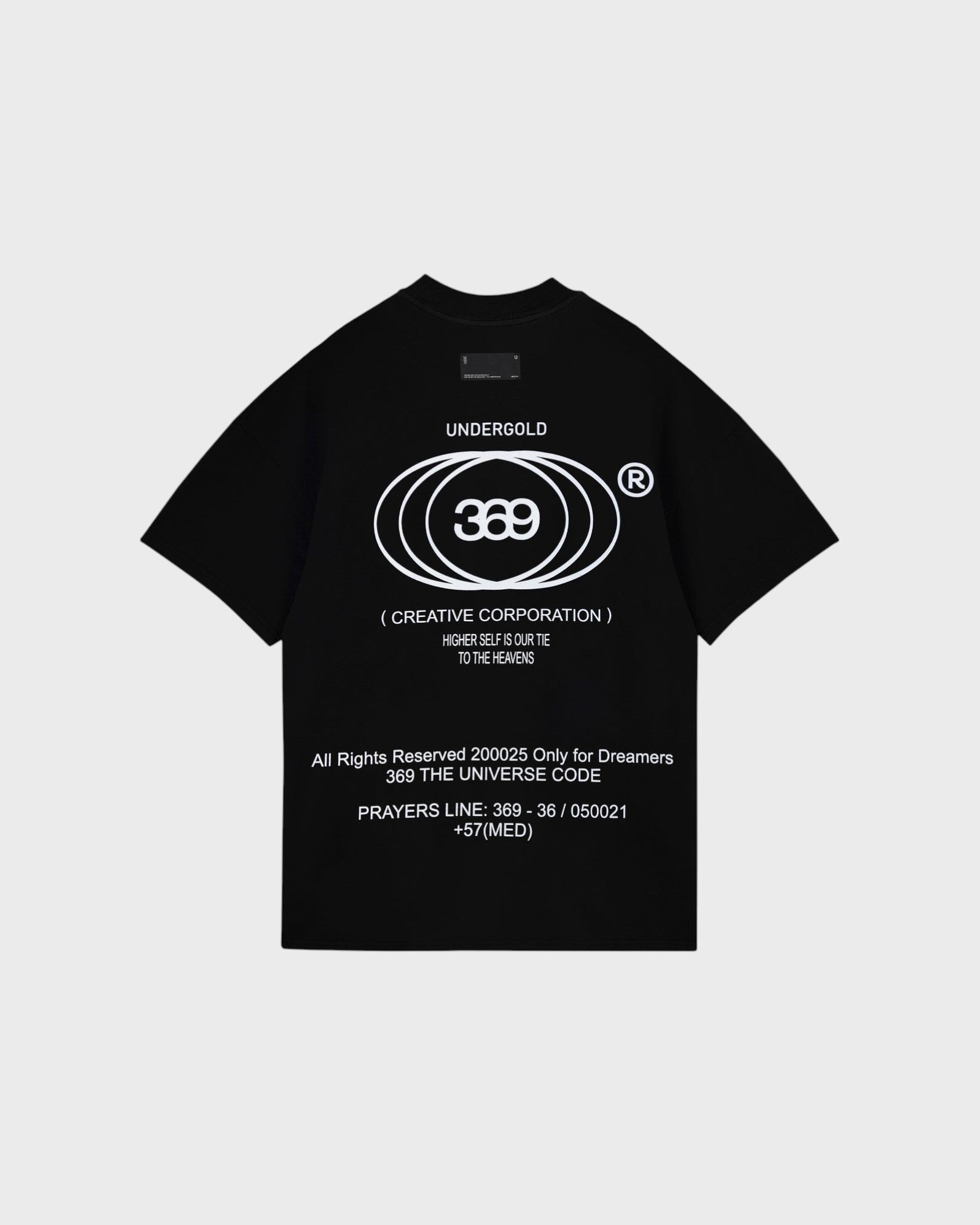 BLACK T-SHIRT WITH A OVERSIZED FIT, MADE WITH 100% HEAVYWEIGHT COTTON FABRIC (290G), INTERVENED WITH TEXTIILE PRINT ON THE FRONT AND BACK.