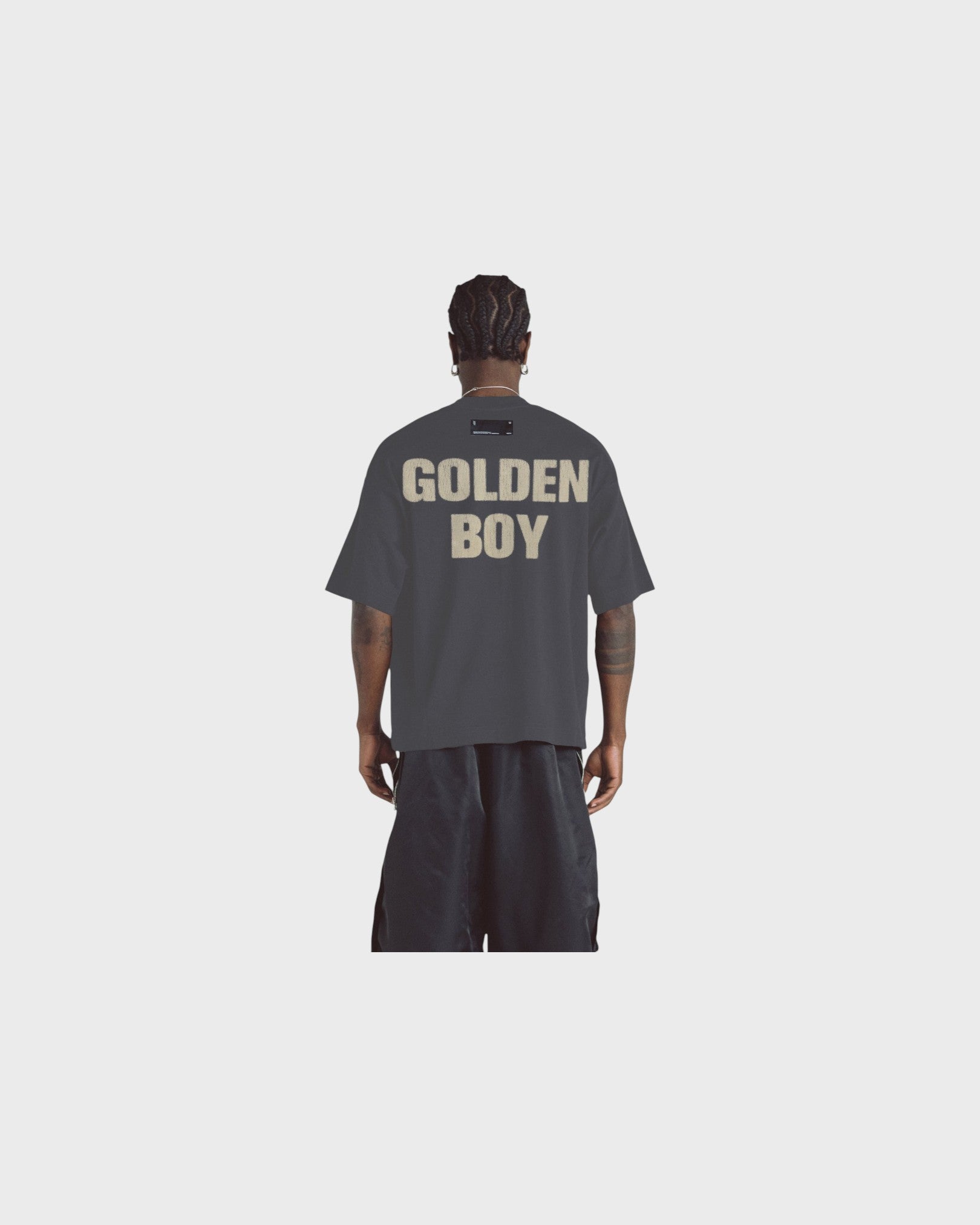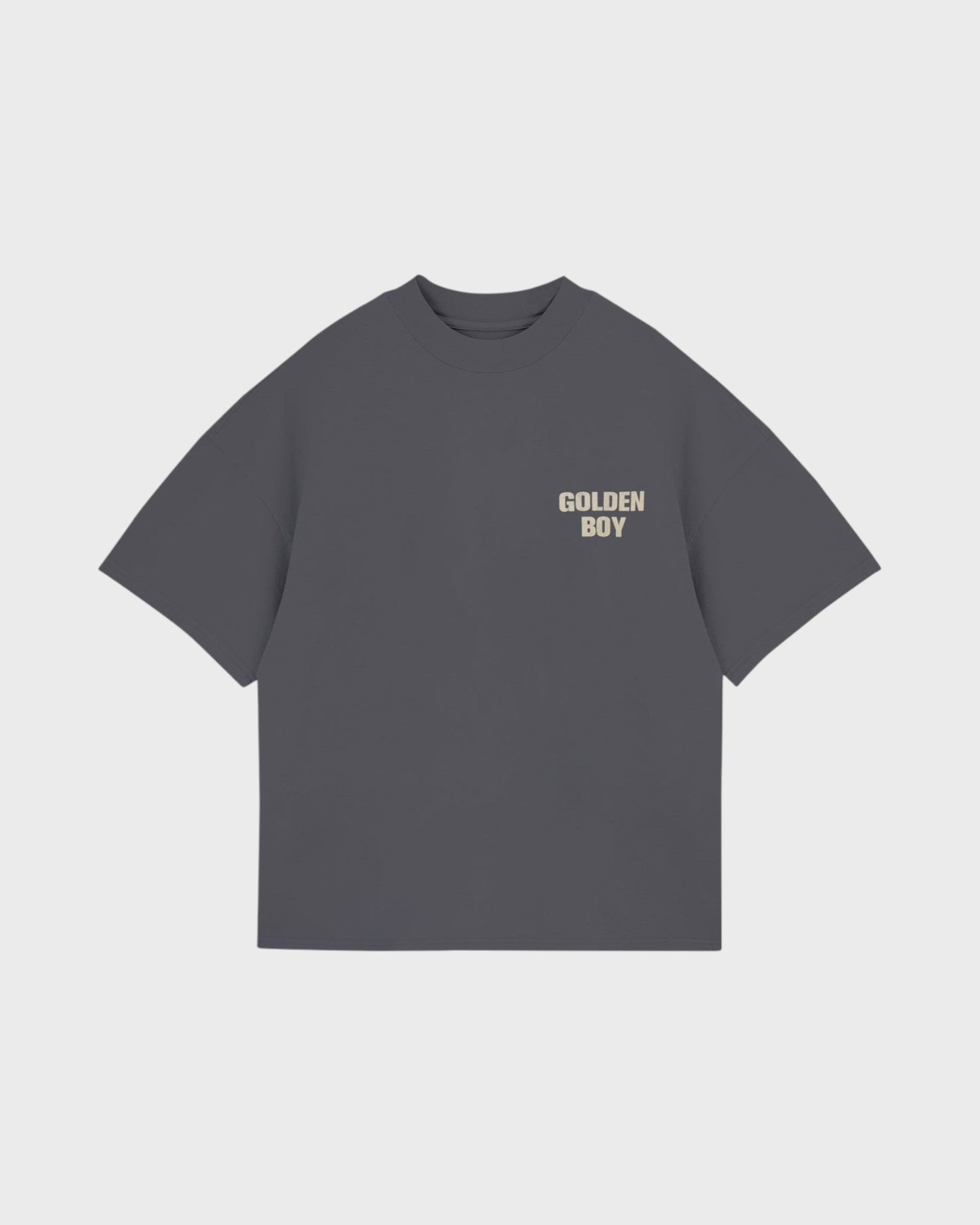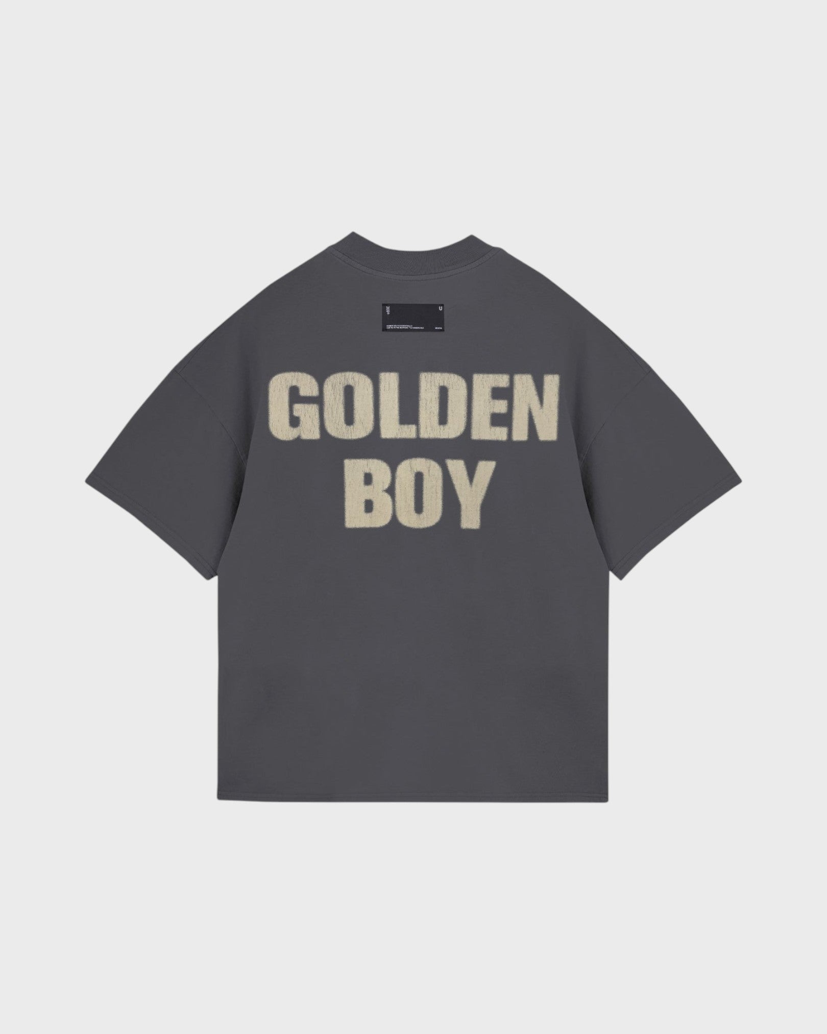 GRAY T-SHIRT WITH A BOXY FIT, MADE QITH 100% HEAVYWEIGHT COTTON FABRIC (290G), INTERVENED WITH TEXTIILE PRINT ON THE FRONT AND BACK.