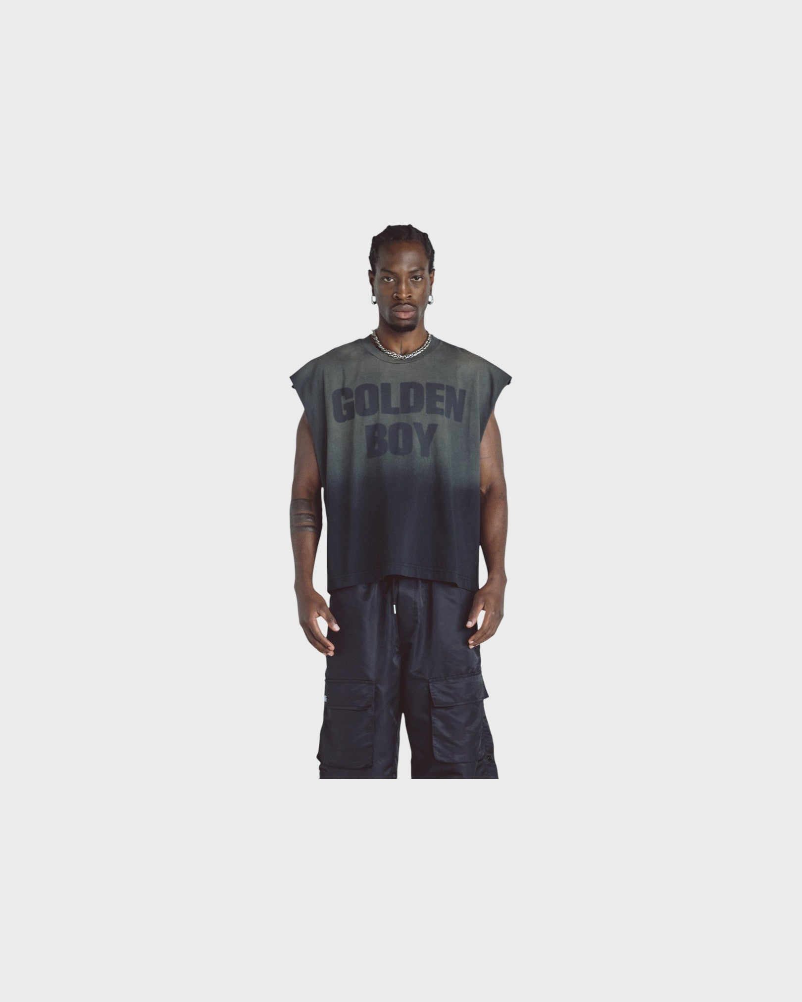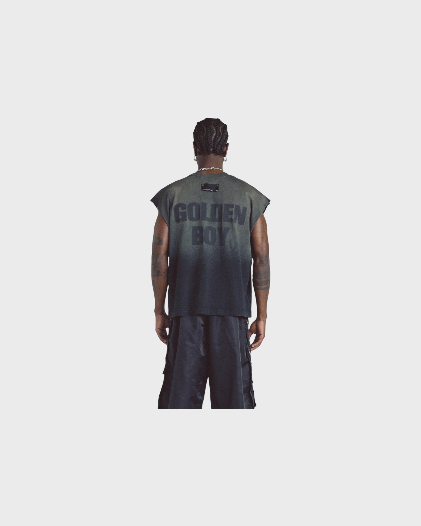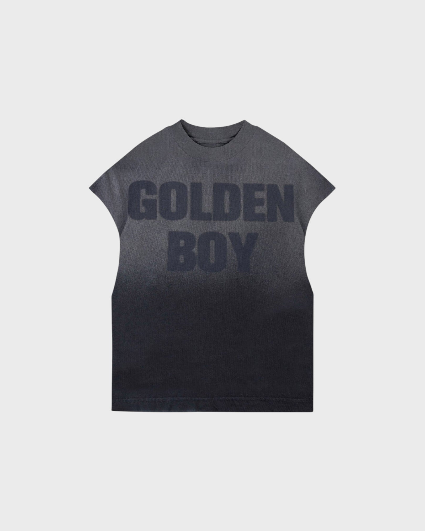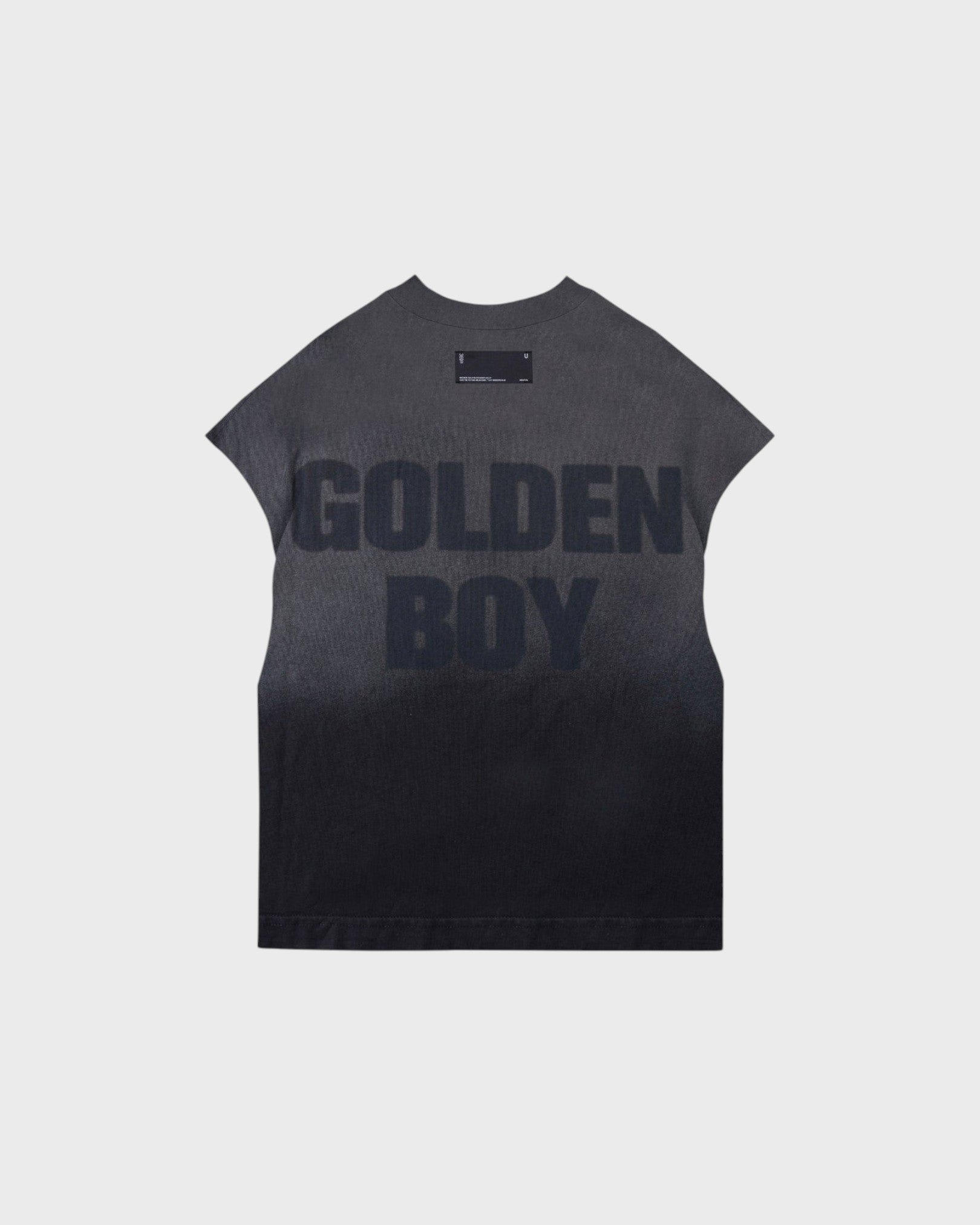 FADDED BALCK SLEEVELESS T-SHIRT WITH A BOXY FIT, MADE OF 100% HEAVYWEIGHT COTTON FABRIC (230G), INTERVENED WITH TEXTILE PRINT ON THE FRONT AND BACK.