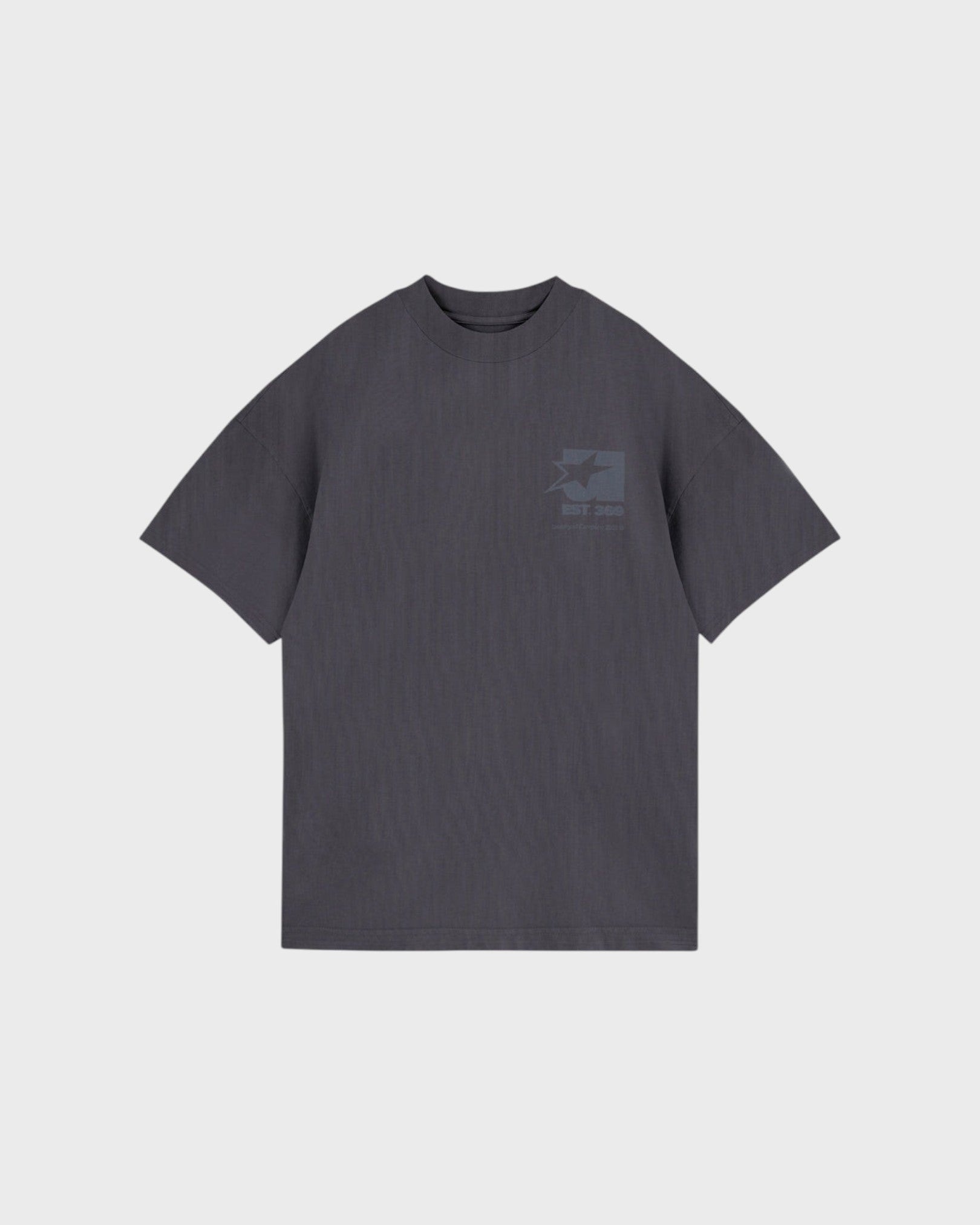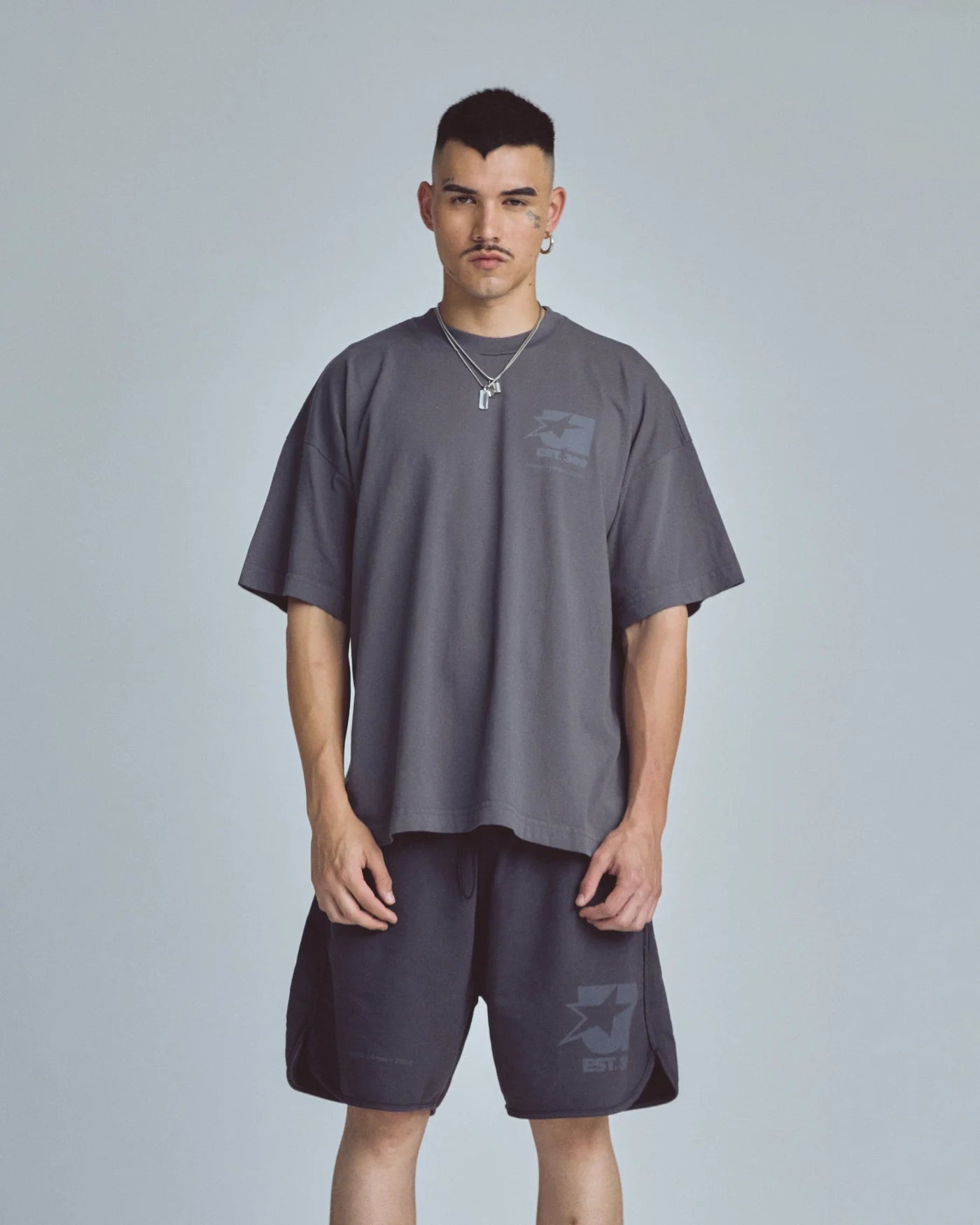 Gray T-shirt with an Oversized fit, made of 100% heavyweight cotton fabric (230 gr), intervened with textile print on the front and back.