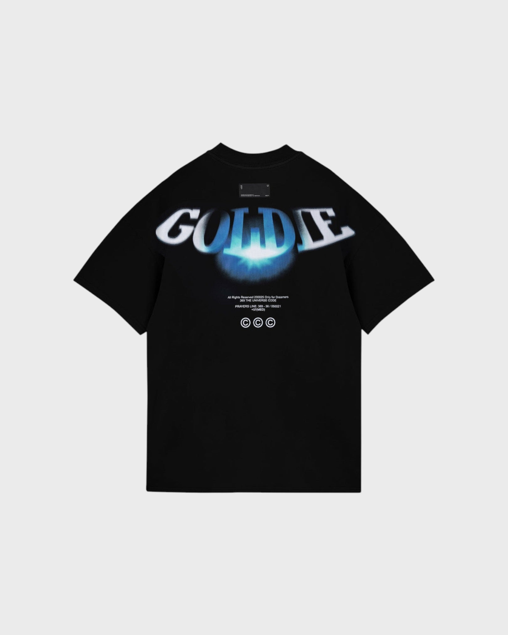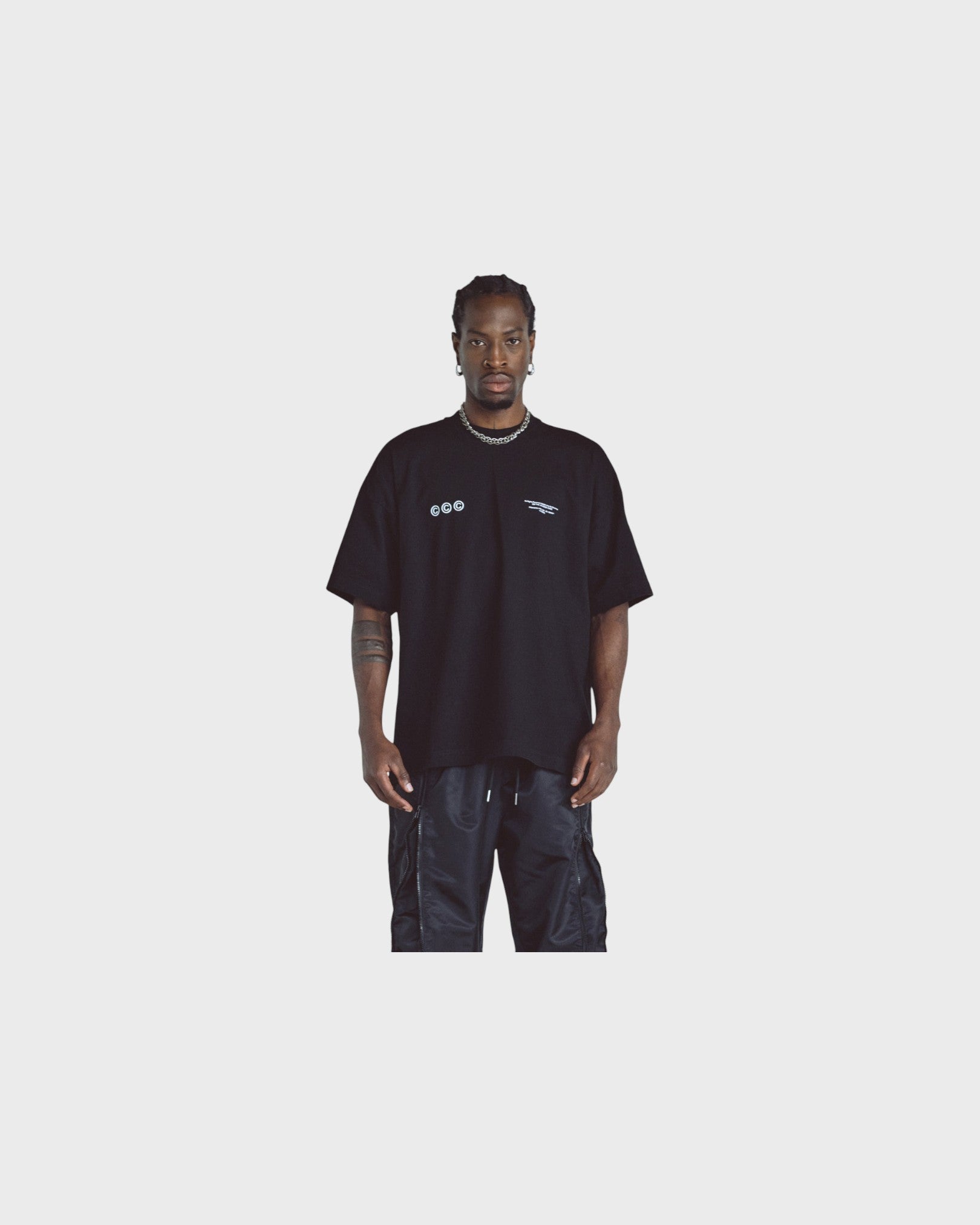 BLACK TSHIRT WITH AN OVERSIZED FIT, MADE OF 100% HEAVYWEIGHT COTTON FABRIC (230GR), INTERVENED WITH GRAPHIC POLYCHROME PRINT ON THE BACK. ALSO, DEVELOPED WITH WHITE FLAT PLASTISOL ON THE FRONT AND BACK.