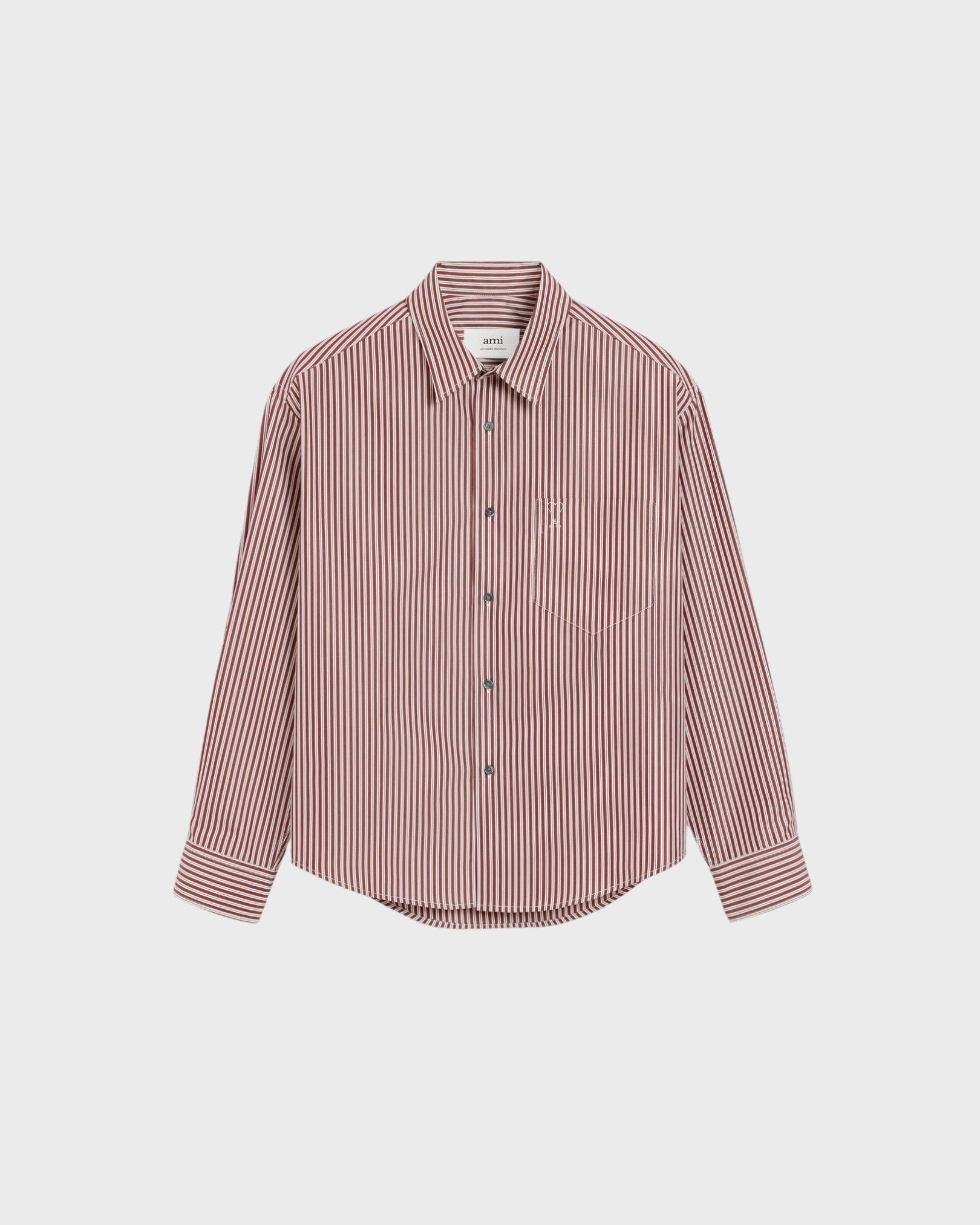 Embossed Ami de Coeur shirt in striped coton popeline. Unisex product Boxy fit Classic collar Buttonned tab on front and cuffs Mother of pearl buttons Tonal Ami de Coeur embroidery on the chest 72 cm center back length (size M) Made in Poland (with love)
