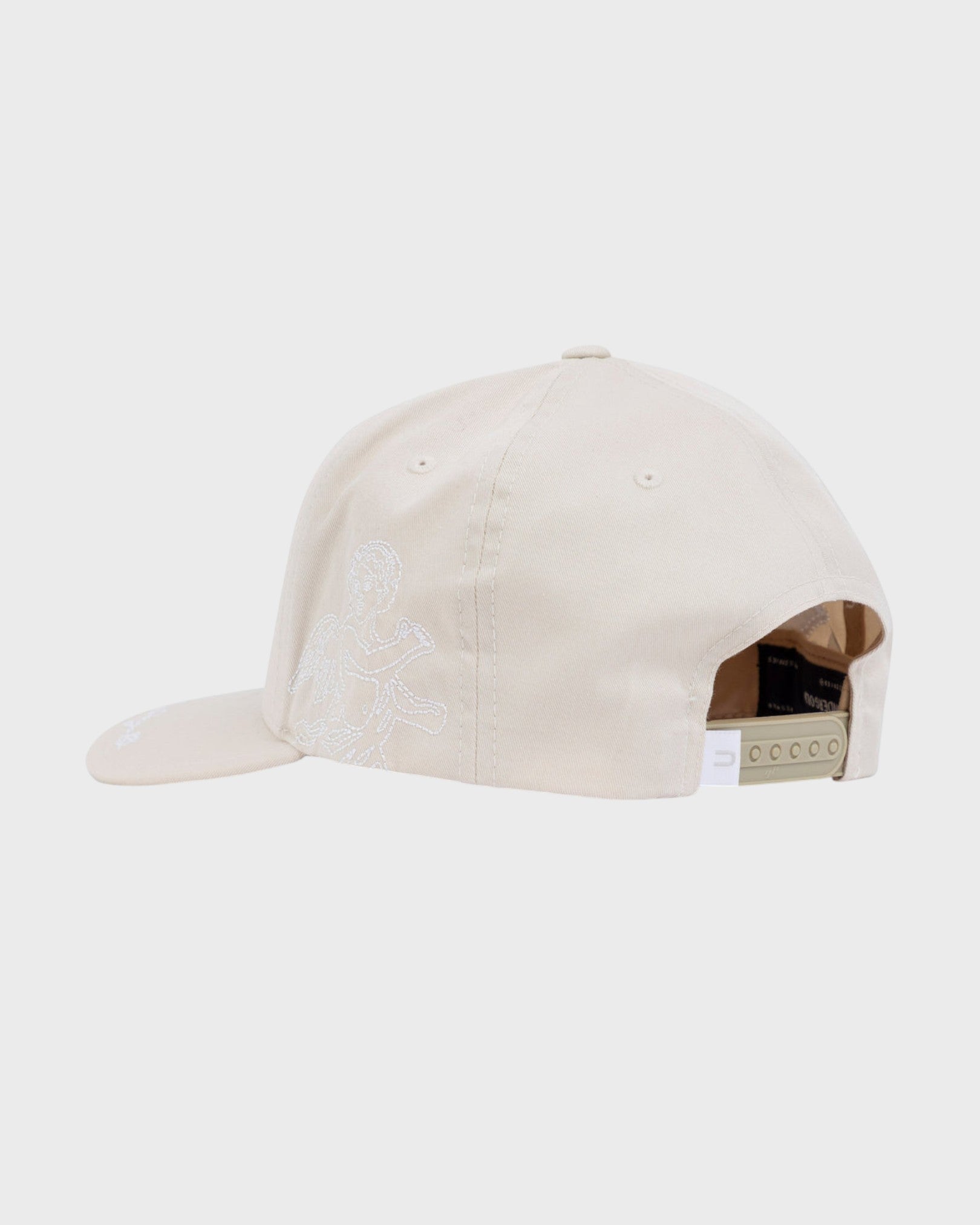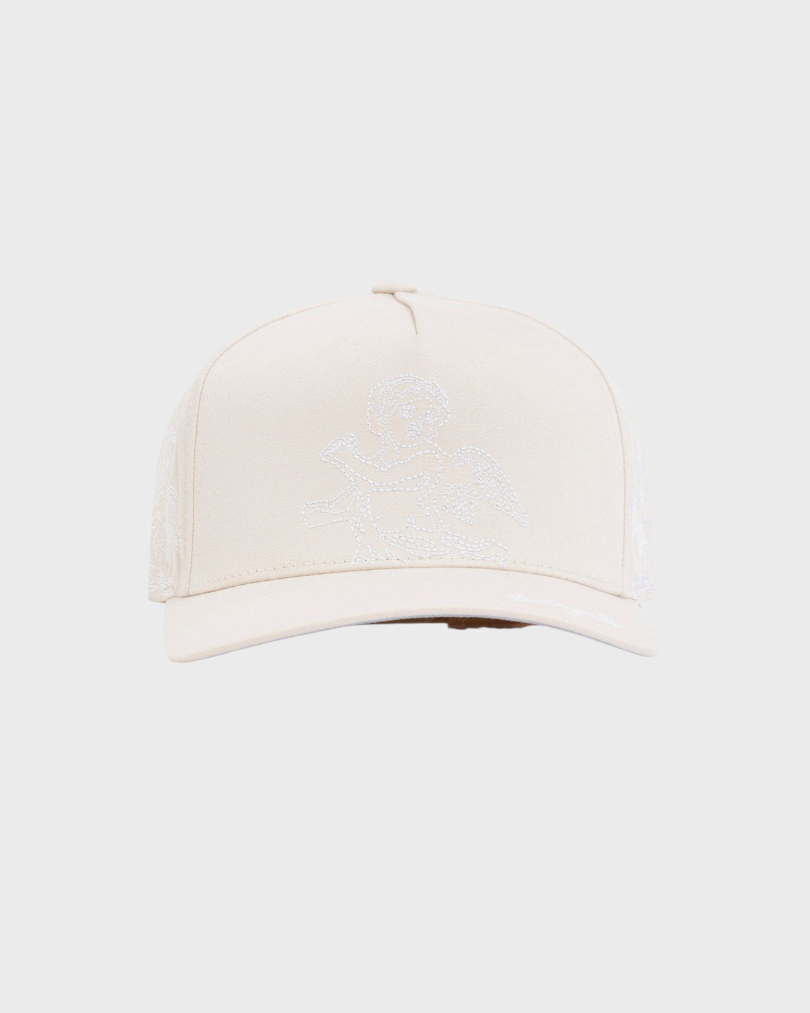 Cream High Crown cap, made of drill fabric, intervened with white flat embroidery on the front, both sides and visor.