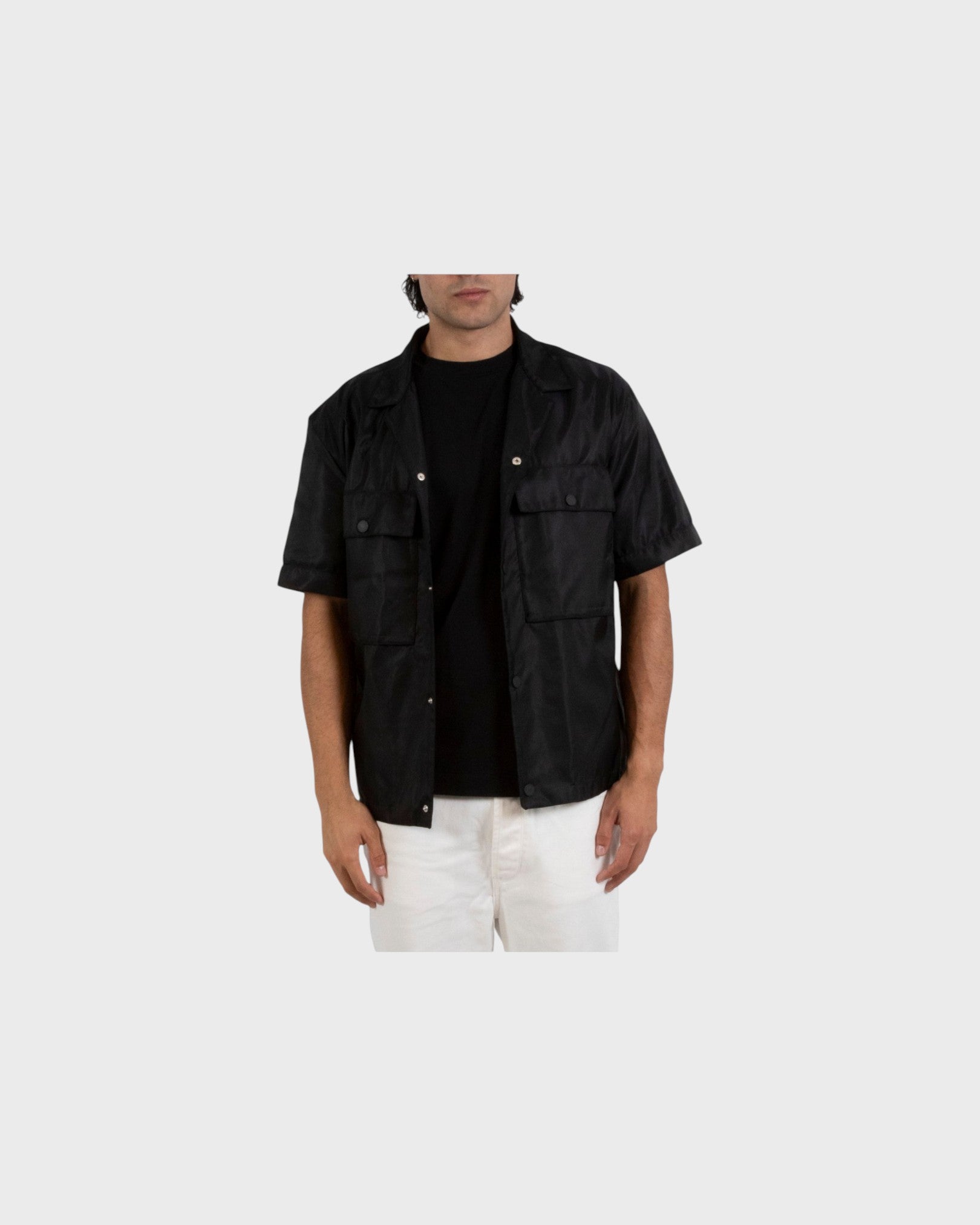A Boxy-fit nylon shirt with snap closure and two front pockets, featuring a printed logo on the back for a modern and functional design.