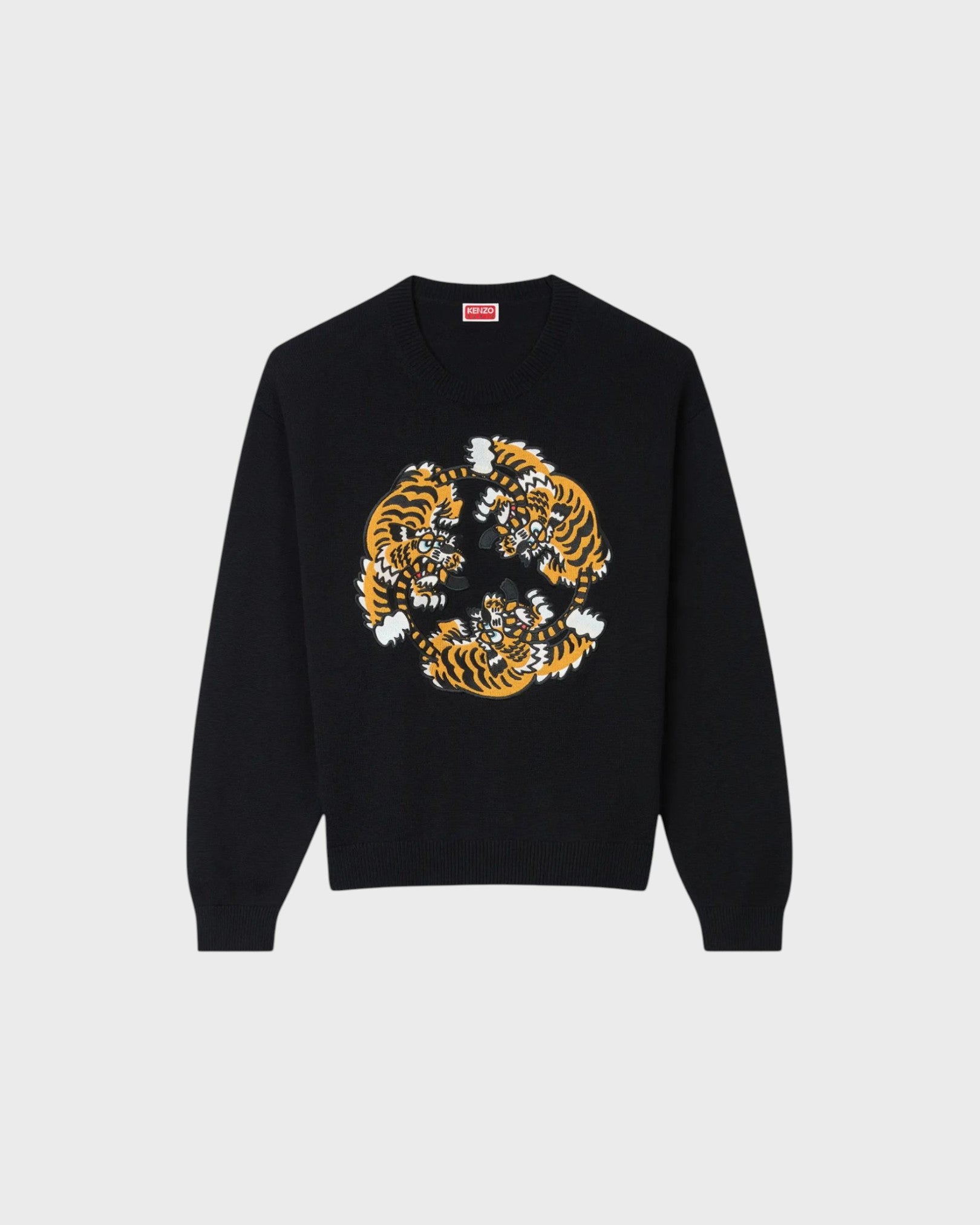 This jumper echoes the universe of KENZO VERDY MARKET with a new twist on the signature Tiger graphic. The blend of satin-stitch embroidery, materials and textures gives the knitwear a 3D effect, bringing the graphic to life.