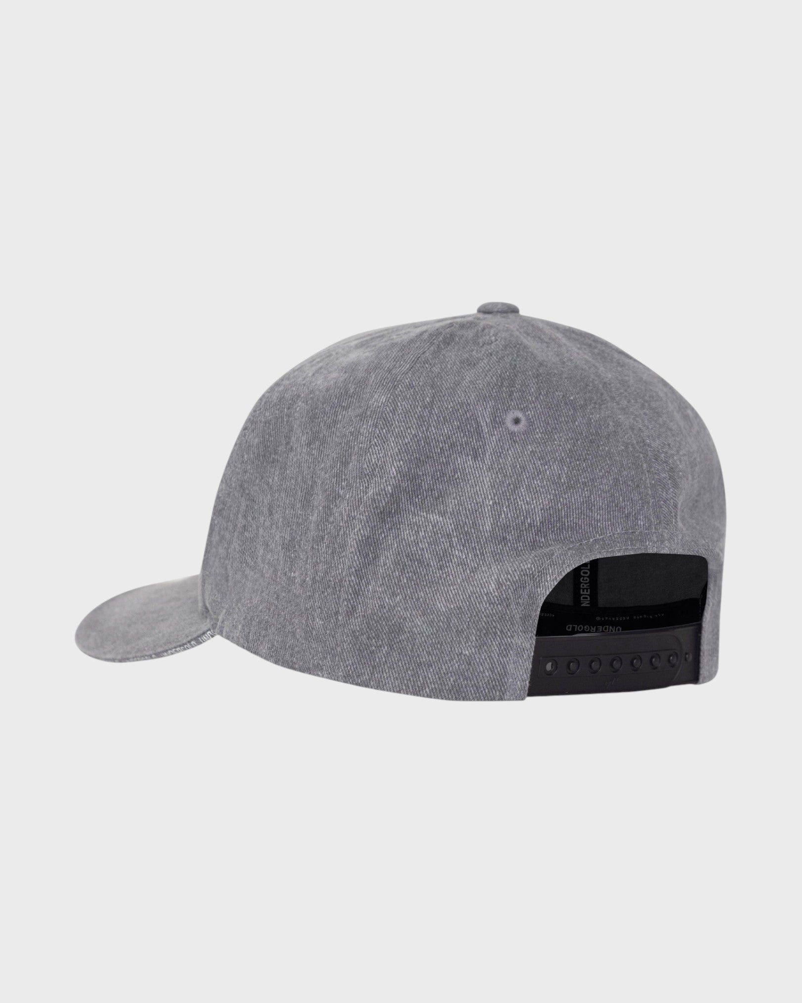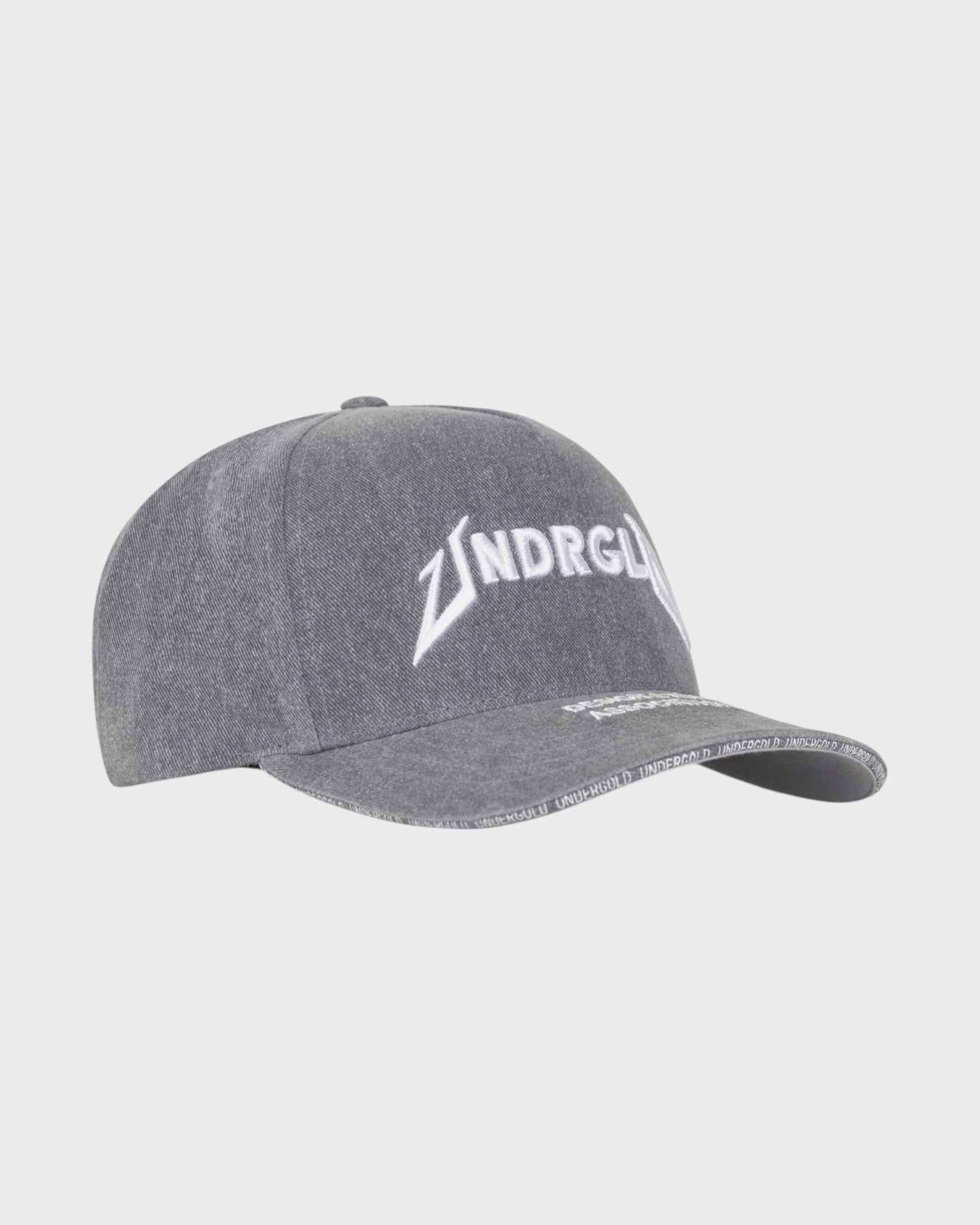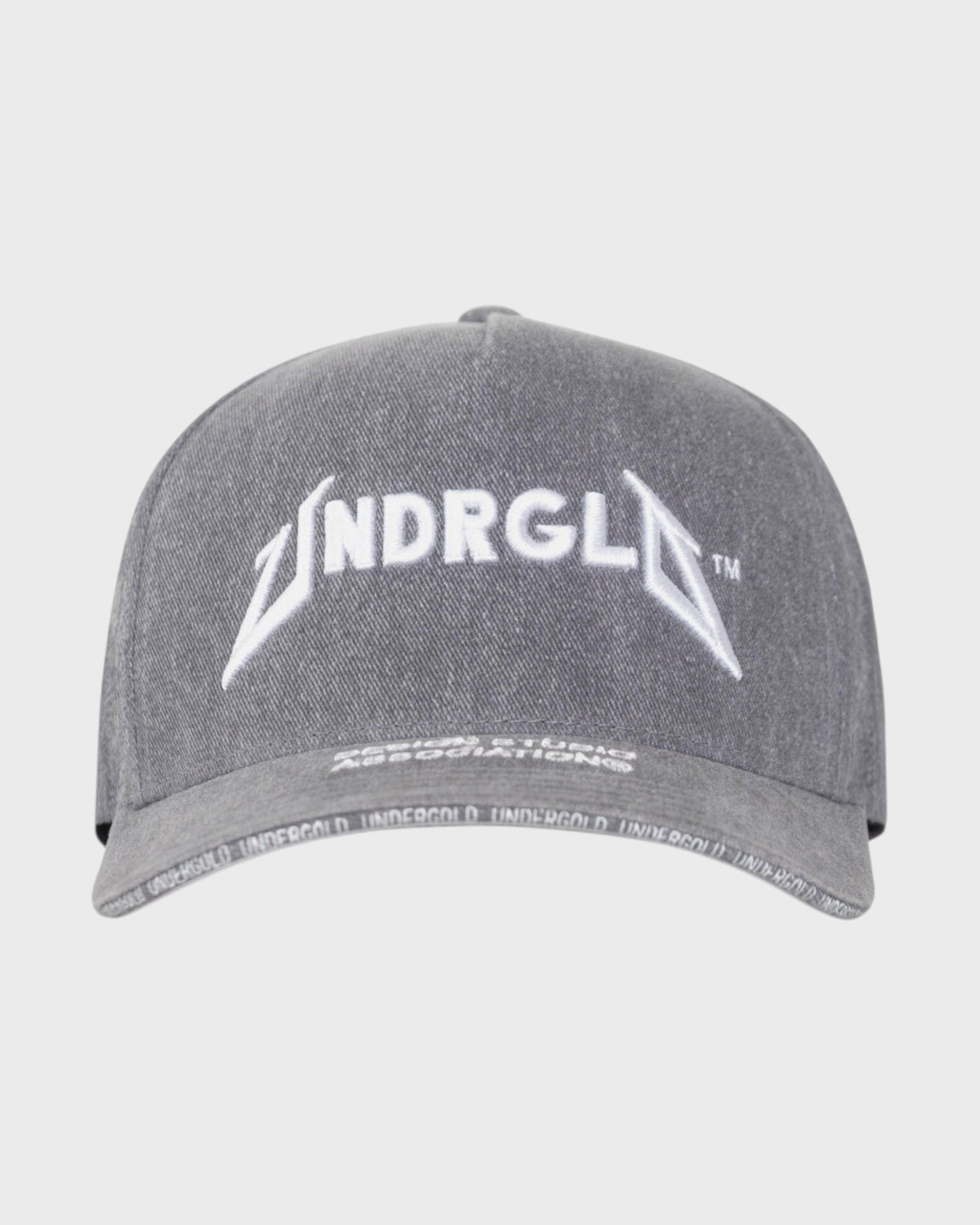 Vintage Gray High Crown cap, made of drill fabric, intervened with white embroidery and white flat plastisol print on visor. Also intervened with embroidery + white foam on the front.